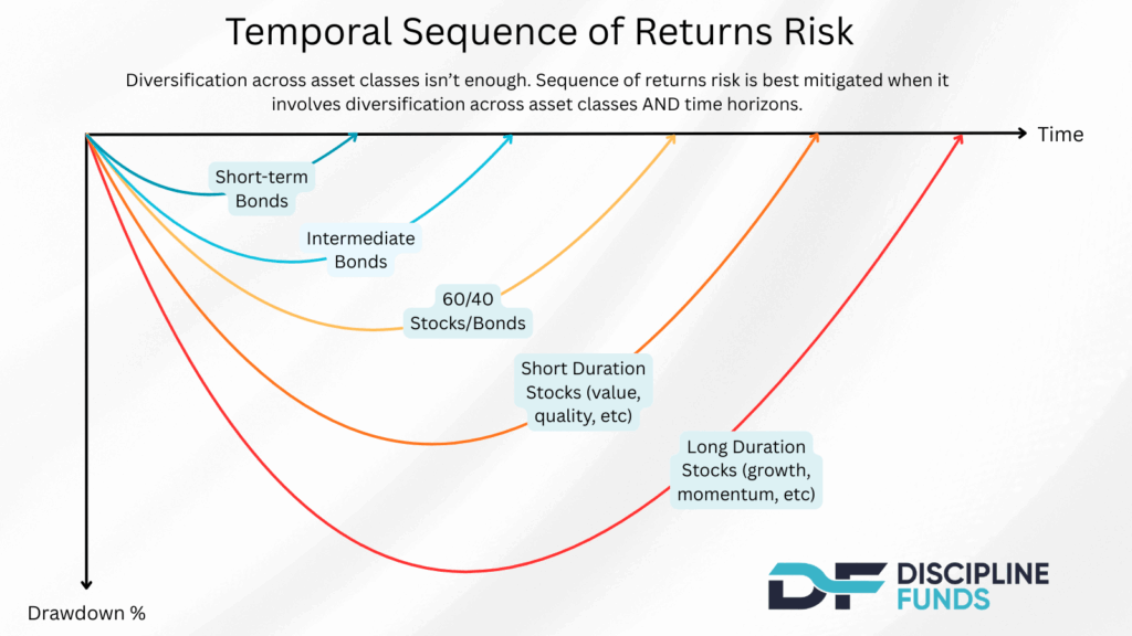 I made this pretty picture to try to communicate this concept. The basic thinking is that different instruments expose you to different sequence risk across time. For instance, stocks typically expose you to higher sequence risk than bonds. But you can get very granular with this concept where you can structure a portfolio where you know that something like T-Bills have almost no sequence risk versus something like intermediate bonds, which have moderate sequence risk. But then the stock market also has sequence risk inside of itself. Growth stocks, for instance, will typically have higher sequence risk than something like low volatility stocks or value stocks. So, when you build a diversified portfolio you want to make sure you’re diversified across instruments with different sequence risk exposure.