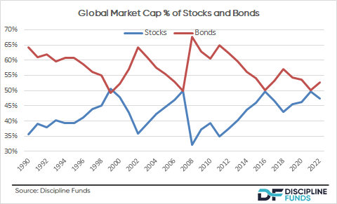 If an investor followed a truly “passive” approach they would let their stock/bond allocation float as the market caps change across time. The problem with this approach is that the relative market caps are highly dynamic and tend to boom and bust across time as investors overreact on the upside and downside. This means that if we purchased a truly passive portfolio we would end up being overweight stocks after they’ve boomed and underweight stocks after they’ve busted. This doesn’t make sense.